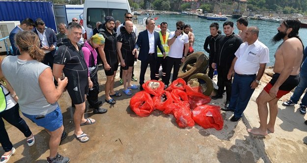 Tarihi Kaleiçi semti Yat Limanı'nda deniz dibinde yapılan temizlikte 10 çuval atık çıktı. Dalgıç kıyafetlerini giyerek denize giren Muratpaşa Belediye Başkanı Uysal da çalışmalara katıldı.