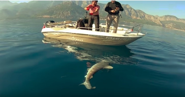 Antalya’da Poyraz Çağan isimli küçük tekneyle denize açılan balıkçıların oltasına dev köpek balığı takıldı. Balıkçılar, oltalarına takılan köpek balığını görünce şaşkına döndü. Oltaya takılan ancak kaçmayı başaran köpek balığının 50 kilonun üzerinde olduğu belirtildi.