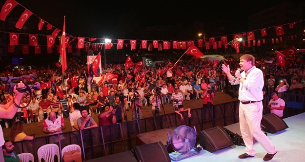 Cumhuriyet Meydanı’ndaki coşkulu kalabalığa seslenen Büyükşehir Belediye Başkanı Menderes Türel, 30 Mart 2014 yerel seçimleri öncesi, 15 Mart tarihinde gerçekleşen mitingde yaptığı bir konuşmayı hatırlattı : “2014 yerel seçimlerde darbecilere hep birlikte dur diyeceğiz demiştim ama bunlar o gün o mesajı almamışlar. 15 Mart’ta anlamadıkları mesajı 15 Temmuz’da hep birlikte verdik. 15 Mart 2014 tarihinde Kepez Spor Salonunun hemen yanındaki alanda Antalya tarihinin en büyük mitingini 120 bin kişi ile gerçekleştirmiştik. Cumhurbaşkanımız Recep Tayyip Erdoğan o gün Başbakanımız olarak o mitinge teşrif etmişlerdi. Sahneye çıkınca müthiş kalabalığı ve coşkuyu gördü ve sözlerine şöyle başlamıştı; Maşallah Tebarekallah bugün ne güzelsin Antalyam” demişti. Aziz Antalyalılar size her zaman ne kadar teşekkür etsek azdır” diye konuştu.