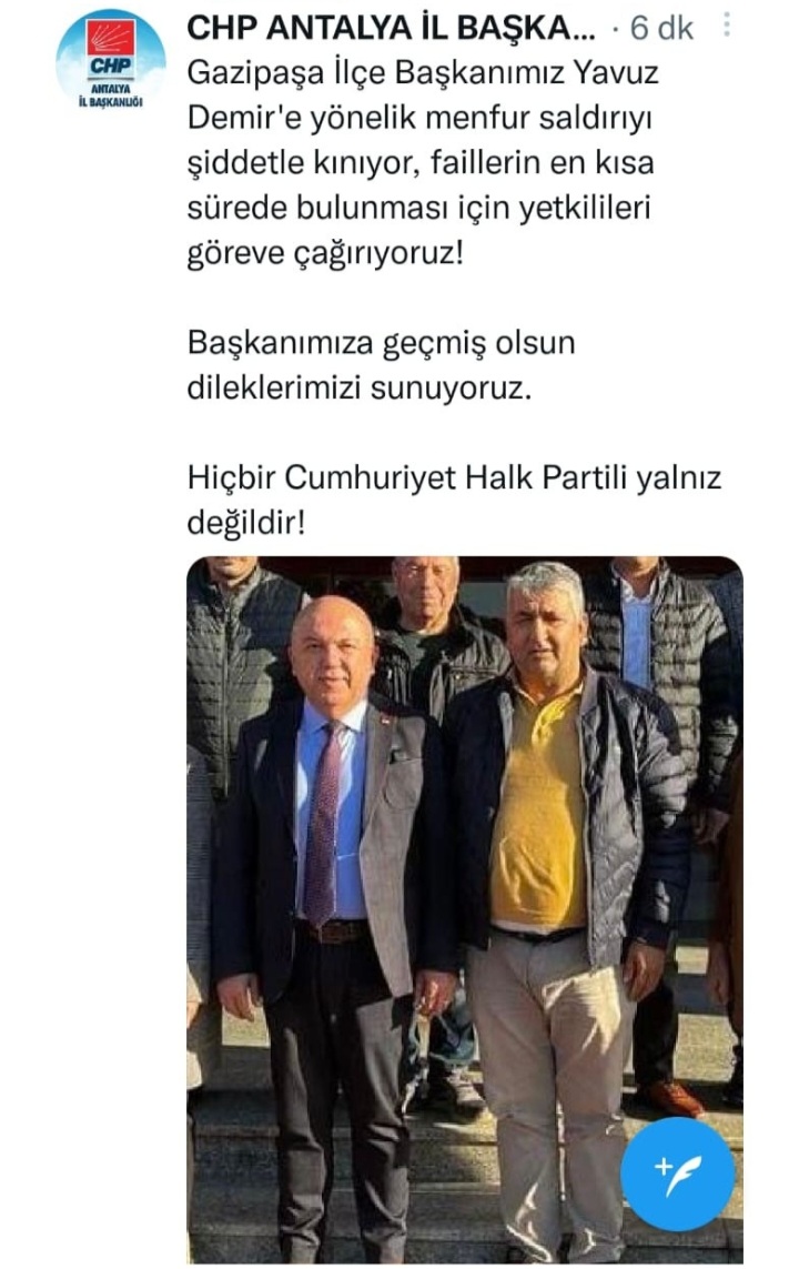 Cumhuriyet Halk Partisi (CHP) Gazipaşa İlçe Başkanı Yavuz Demir, maskeli iki kişinin saldırısına uğradı.