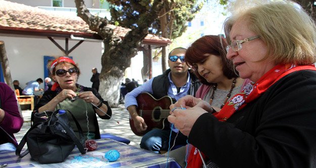 Kahvehanelerde kadınların varlığının olduğunu göstermek için böyle bir etkinlik yaptıklarını belirten Al Yazma Kadın Danışma Merkezi üyelerinden Öznur Özçoban, “Al yazmalı kadınlarımız yaptıkları ürettikleri el işlerini burada devam ettirebiliyorlar. Sohbet ediyorlar, tavlasını, okeyini oynayabiliyorlar. En önemlisi sosyal yaşama dahil oluyorlar. Ördüğümüz örgüleri de bahçe kenarlarındaki ağaçlara giydiriyoruz. Sevgimizi gösteriyoruz, kadının elinin değdiğini belli etmek için iz bırakıyoruz” dedi.