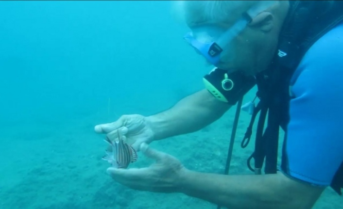 Konyaaltı sahilinde dün öğrencileriyle birlikte denizanalarını görüntülemek için dalış yapan Akdeniz Üniversitesi (AÜ) Su Ürünleri Fakültesi Öğretim Üyesi Prof. Dr. Mehmet Gökoğlu, bir amatör balıkçının misinasına takılmış haldeki naylon balığını fark etti. Oldukça bitkin görünen balığı eliyle tutan Gökoğlu, yanında getirdiği bıçakla kopmuş haldeki misinayı balığın ağzına yakın kısımdan kesti. Özgürlüğüne kavuşan naylon balığı bölgeden uzaklaşırken, o anlarsa su altı kamerasına saniye saniye yansıdı.
