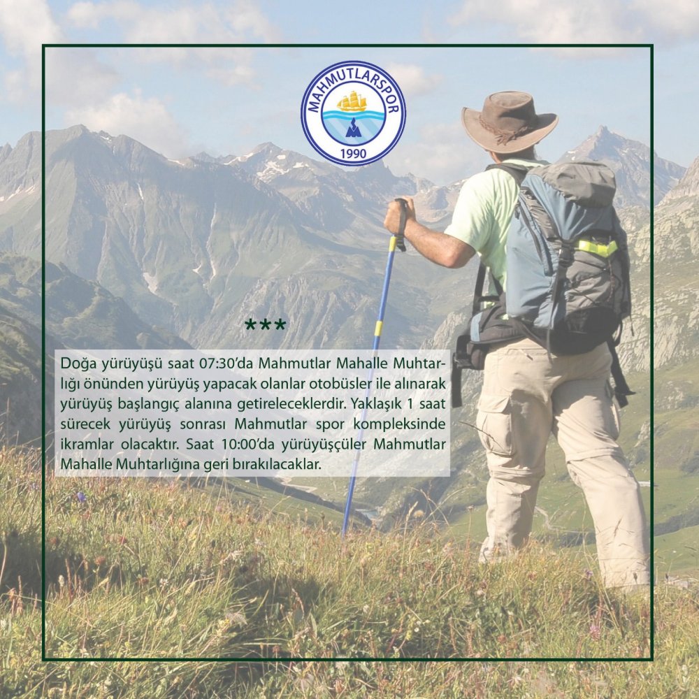 Bağışlar, “Gündelik hayatın yoğunluğundan uzaklaşmak isteyen doğa severleri, 9 Ekim Pazar günü saat 07.30’da Mahmutlar Muhtarlığı önünde buluşmaya davet ediyoruz. Her zaman ilklere öncelik eden Mahmutlar, sağlıklı gelecek için spor yaparak örnek olmaya devam ediyor. Doğa yürüyüşü sonrasında Mahmutlarspor merkezinde sucuk ekmek ikramımız olacaktır. Yaş sınırlaması yoktur. Bütün hemşehrilerimizi bekliyoruz” dedi.