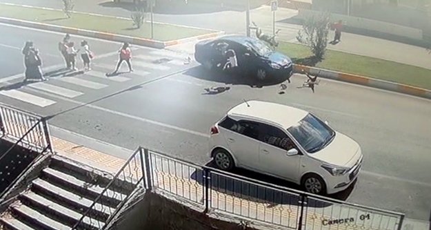 Antalya'nın Manavgat ilçesi Emniyet Müdürlüğü karşısında yaya geçidini kullanan yayalara otomobilin çarpması sonucu anne ve 2 kızı yaralandı. Kaza anı bir iş yerinin güvenlik kamerasına saniye saniye yansıdı.