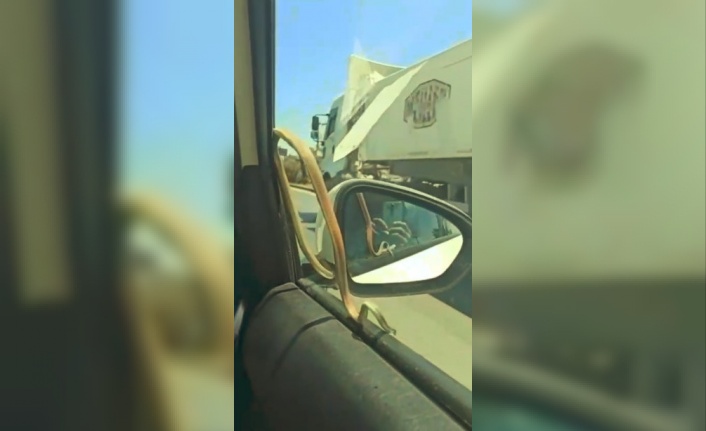 Antalya’da bir sürücünün aracının yan aynasına dolanan yılanla yolculuk yapması şaşkınlık oluşturdu.