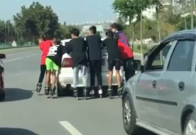 Muratpaşa ilçesi Dumlupınar Bulvarı üzerinde öğle saatlerinde cep telefonu kamerasına yansıyan görüntüler 'bu kadarına da pes' dedirtti. Görüntülerde patenli 7 gencin bir arabaya tutunarak trafikte ilerlediği görüldü. Gençlerin kask takmadığı da görülürken, bir vatandaş tarafından saniye saniye kaydedilen o görüntüler yürekleri ağızlara getirdi. Sürücüler ise trafiğin zaman zaman durmasına korna çalarak tepki gösterdi.