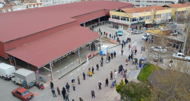 Antalya'nın Korkuteli ilçesinde her hafta Çarşamba günü kurulan ilçe pazarına girmek isteyenler bir kilometrelik kuyruk oluşturdu. Pazar yeri girişinde sosyal mesafe kuralları harfiyen uygulandı.