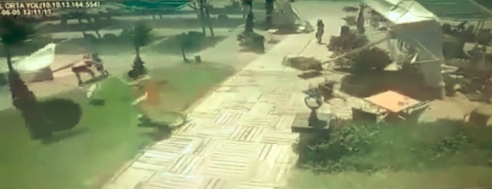 O anlar otelin güvenlik kamerasına anbean yansıdı. Güvenlik kameralarına yansıyan görüntülerde, aniden çıkan şiddeti rüzgarın ardından havaya uçan şemsiyeler ve panik halindeki turistler yansıdı. Öte yandan görüntülerde, uçan şemsiyenin altında annesinin refleksiyle son anda kurtulan küçük çocuk görüldü. Bir refleksle kurtulan çocuğun annesi olası bir kazanın önüne geçti.