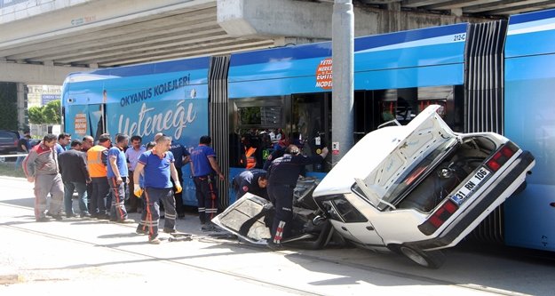 Antalya’da kavşakta tramvay ile otomobil çarpıştı. Otomobilin hurdaya döndüğü kazadan yara almadan kurtulan sürücünün aracının zarar görmemiş parçalarını toplaması ise şaşkınlık oluşturdu.