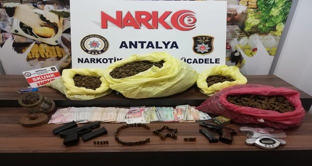 Antalya İl Emniyet Müdürlüğü Narkotik Suçlarla Mücadele Şube Müdürlüğü görevlileri uyuşturucu madde ticareti yapan şahıs ve gruplara yönelik çalışmalarını sürdürüyor. Bu kapsamda Konyaaltı ilçesi Liman mahallesinde bulunan Rent-A-Car işyerinde arama yapan görevliler 1 kilo skunk esrar maddesi ele geçirdi. Olayla ilgili G.P. ile A.A.R. gözaltına alındı. Çalışmalarını sürdüren polis, C.B. ile A.A.’nın içinde bulunduğu araçta da yaptığı aramada, uyuşturucu madde ticaretinden elde edildiği değerlendirilen 17 bin 470 lira ile sahte olduğu tespit edilen 1 adet nüfus cüzdanı ve 1 adet sürücü belgesi ele geçirildi. A.A.’nın Liman Mahallesinde bulunan evinde yapılan aramada ise 4 kilogram skunk esrar maddesi ile birlikte 1 adet Hassas Terazi, 2 adet ruhsatsız tabanca ve bu tabancalara ait 9 mm çapında 50 adet dolu fişek, uyuşturucu madde ticaretinden elde edildiği değerlendirilen 100 pound, 5 bin 750 Euro ve bin 235 dolar para ele geçirildi. Yakalanan şüpheli A.A.’nın kasten öldürme, 2 adet basit yaralama, 1 adet görevi yaptırmamak için direnme ve 1 adet karşılıksız yararlanma suçlarından aranmasının olduğu tespit edildi.