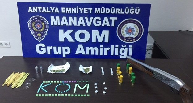 Manavgat İlçe Emniyet Müdürlüğüne bağlı ekipler, uyuşturucu madde ticareti yapan, kullanan ve bulunduran şahıs ve gruplara yönelik gerçekleştirdikleri çalışmalar kapsamında bir aracı durdurdu. Araçta bulunan Ü.K. ve C.Ç. isimli şahısların üzerinde yapılan kontrollerde 1 adet pompalı tüfek ve tüfeğe ait 8 adet fişek, 13,94 gram esrar maddesi, 106 adet estasy hap, 4,6 gram metamfetamin olduğu değerlendirilen uyuşturucu madde, 20 adet uyuşturucu madde içmek için kullanılan kargı ele geçirildi.