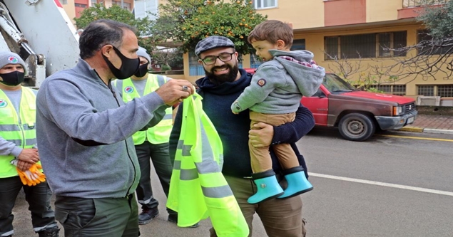 Belediye temizlik ekibi ile tanışmanın mutluluğunu yaşayan Yusuf’a ise temizlik işlerine ait üniforma hediye edildi.