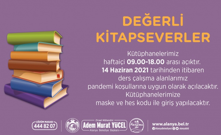 Alanya Belediyesi’nden yapılan açıklamada, “Değerli kitapseverler, kütüphanemiz hafta içi 09.00-18.00 arası açıktır. Bugünden itibaren de ders çalışma alanlarımız, pandemi koşullarına uygun olarak sizlere hizmet verecektir.” ifadeleri kullanıldı.