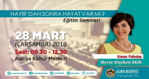 Alanya Belediyesinin eğitim seminerleri son hızıyla devam ediyor. Alanya halkını bilinçlendiren seminerlerden bir yenisi de 28 Mart tarihinde gerçekleştirilecek. Uzman Psikolog Merve Otçeken Akın'ın konuşmacı olacağı 'Hayır'dan sonra hayat var mı?' isimli seminer 28 Mart'ta Alanya Külür Merkezinde saat 09.30'da başlayacak. Katılımın ücretsiz olduğu 3 saat sürecek olan seminere tüm Alanya halkı davet edildi.