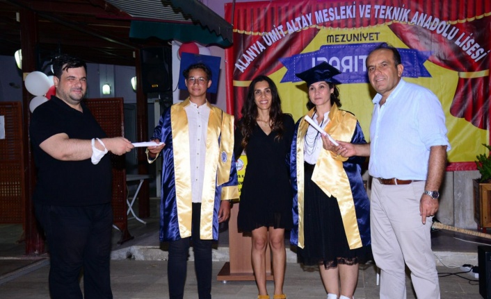 Alanya’nın proje okullarından biri olan Ümit Altay Mesleki ve Teknik Anadolu Lisesi’nin 2020-2021 yılı mezunları okullarındaki uygulama otelinde havuz başında coşkulu bir şekilde kutlandı. Geceyi unutulmaz kılan olaysa anne ve oğlun birlikte mezun olmasıydı. Anne Çiğdem T.  okulun bünyesinde bulunan Açık Öğretim Lisesi’nden oğlu Seyit Efe A. ise üç dilde (İngilizce, Almanca, Rusça) alanından, hayatı boyunca burs veren Ümit Altay Mesleki ve Teknik Anadolu Lisesi’nin Konaklama ve Seyahat Hizmetleri alanından mezun oldu. Anne Çiğdem T. diplomasını “Meslek Lisesi Memleket Meselesi” sloganı ile meslek liselerinin ülke kalkınmasındaki önemini sürekli vurgulayan İlçe Milli Eğitim Müdürü Yusuf Yılmaz’ın elinden aldı.