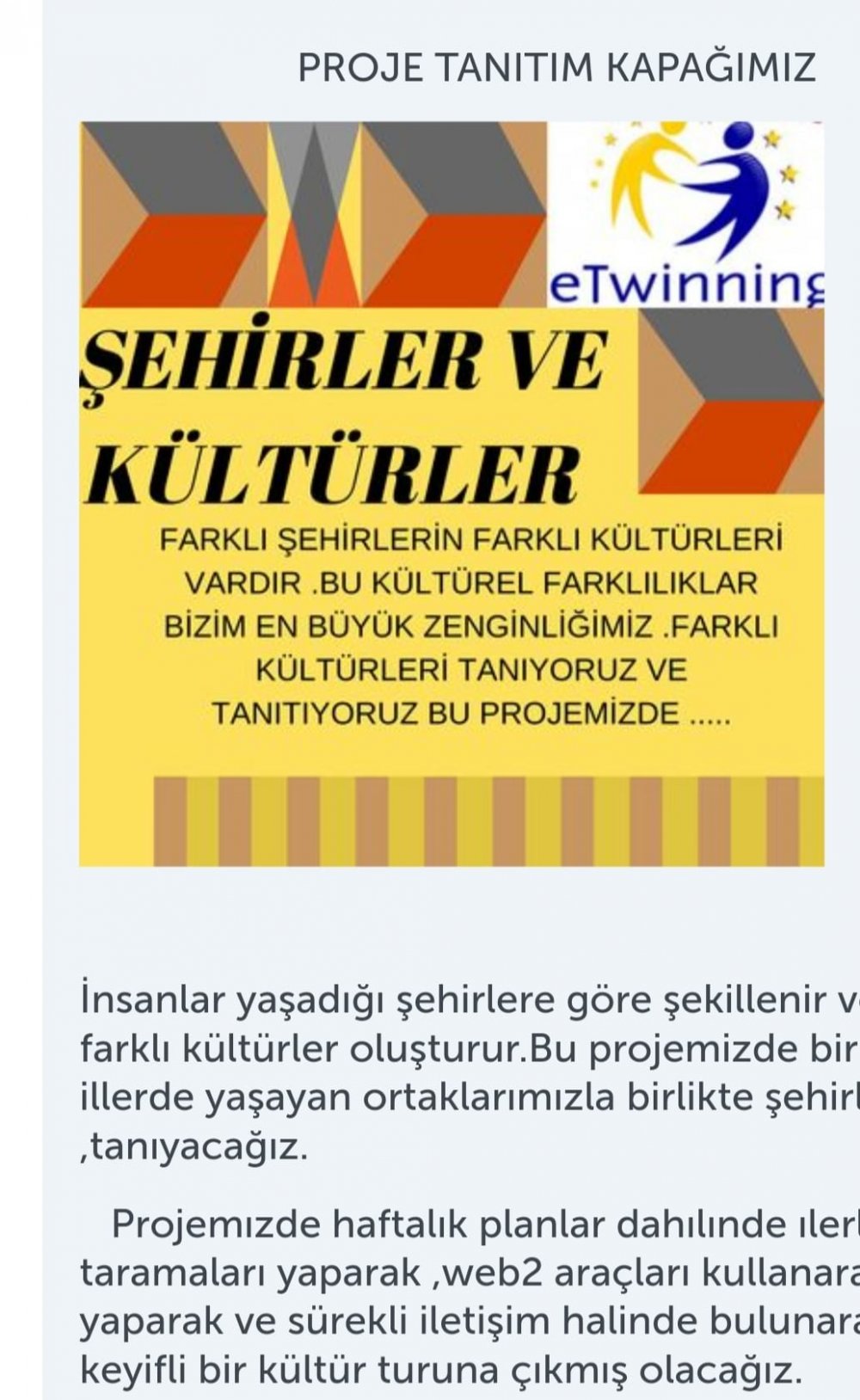 Projenin amacı: Projemizle ortakları olacağımız farklı şehirlerdeki öğrencilerin birbirleriyle kültürel bir bağ kurmalarını sağlayarak sosyal farkındalığı ve kültürel farkındalığı olan, yaşama daha geniş açıdan bakabilen sosyal öğrenciler yetiştirmeyi hedeflemekteyiz. Bu sayede öğrencilerimiz sosyal iletişim kurarak farklı kültürleri öğrenebilecek ve şehirlerarası bilgi köprüsü kurabileceklerdir.