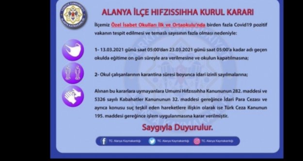 Alanya Kaymakamlığı’nın resmi hesabından yapılan açıklamada, "İlçemiz Özel İsabet Okulları İlk ve Ortaokulu'nda birden fazla Covid19 pozitif vakanın tespit edilmesi ve temaslı sayısının fazla olması nedeniyle 13 Mart 2021 gününden 23 Mart 2021 gününe kadar okulda eğitime 10 gün süreyle ara verilmesine ve okulun kapatılmasına karar verilmiştir. Okul çalışanlarının karantina süresi boyunca idari izinli sayılmalarına, bu karar uymayanların Umumi Hıfzıssıha Kanunu'nun 282. maddesi ve 5326 sayılı Kabahatler Kanunu'nun 32. maddesi gereğince İdari Para Cezası ve ayrıca konusu suç teşkil eden hareketlere ilişkin olarak ise Türk Ceza Kanunu'nun 195. maddesi gereğince işlem uygulanmasına karar verilmiştir."
