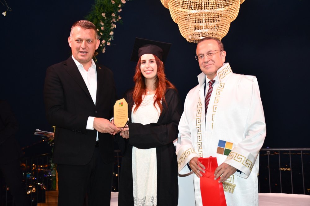 Yapılan konuşmaların ardından mezun olan öğrencilere mezuniyet belgeleri takdim edildi. 2022 -2023 Akademik Yılı’nda okul birincisi olan Natelie Bader’e, mezuniyet plaketi ve hediyesi Alanya Kaymakamı Dr. Fatih Ürkmezer ve Rektör Prof. Dr. Mesut Güner tarafından takdim edildi. Ardından okul birincisi Natelie Bader, mezuniyet kütüğüne isminin yazılı olduğu plakayı çaktı. Diplomalarını bölüm hocalarından teslim alan öğrenciler, mezuniyet sevincini hep birlikte kep fırlatarak kutladı. Öğrenciler mezuniyet coşkusunu veliler, üniversitenin akademik ve idari personeliyle birlikte kutladı.
