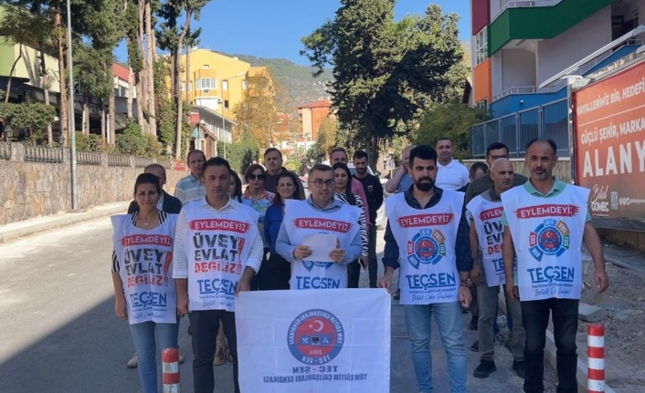 Merkez PTT önünde toplanan sendika üyeleri, ellerindeki pankartlar eşliğinde Atatürk Anıtı önüne kadar yürüyüş yaptı. Eğitim İş Sendikası Alanya Temsilcisi Hüseyin Zeybek ve Eğitim Sen Alanya Temsilcisi Ali Koca tarafından yapılan ortak basın açıklamasında, “Öğretmenlik mesleğini itibarsızlaştıran, öğretmenlerin ekonomik sorunlarına çözüm üretmeyen, eşit işe eşit ücret ilkesini ortadan kaldıran, öğretmenler arasındaki ayrımcılığı ve eşitsizliği derinleştiren Öğretmenlik Meslek Kanunu (ÖMK) düzenlemesine yönelik yoğun tepkilere rağmen, MEB ısrarla somut bir adım atmamaktadır. Türkiye’de aynı işi yaptıkları halde farklı statü ve maaşlarla çalışmak zorunda kalan başka bir meslek grubu yoktur. Öğretmenler arasında halen var olan aday, sözleşmeli, kadrolu, ücretli ayrımına yenilerini eklenirken, eğitim sisteminin rekabetçi ve eleyici yapısına öğretmenlik mesleği de eklenmek istenmektedir. Öğretmenlerin, eğitim emekçilerinin çalışma ve yaşam koşullarına ilişkin sorunları Milli Eğitim Bakanlığı’nın gündeminde değildir. Yıllardır ekonomik, sosyal ve özlük haklarımıza ve geleceğimize yönelik taleplerimiz görmezden gelinmekte, insanca yaşam ve insan onuruna yakışır ücret taleplerimiz yok sayılmaktadır. Öğretmenlerin mesleki birikimini ve niteliğini yok sayan kariyer basamakları uygulamasının öğretmenlik mesleğinin saygınlığını daha da düşürmesine karşı hiçbir eğitim emekçisinin, eğitim alanında örgütlü hiçbir sendikanın sessiz ve tepkisiz kalması beklenemez. Bu amaçla 14 Ekim tarihinde eğitim alanında örgütlü ve mücadeleden yana olan sendikalar bir araya gelmiş ve ortak talepler belirlenmiştir. Taleplerimiz şu şekildedir;