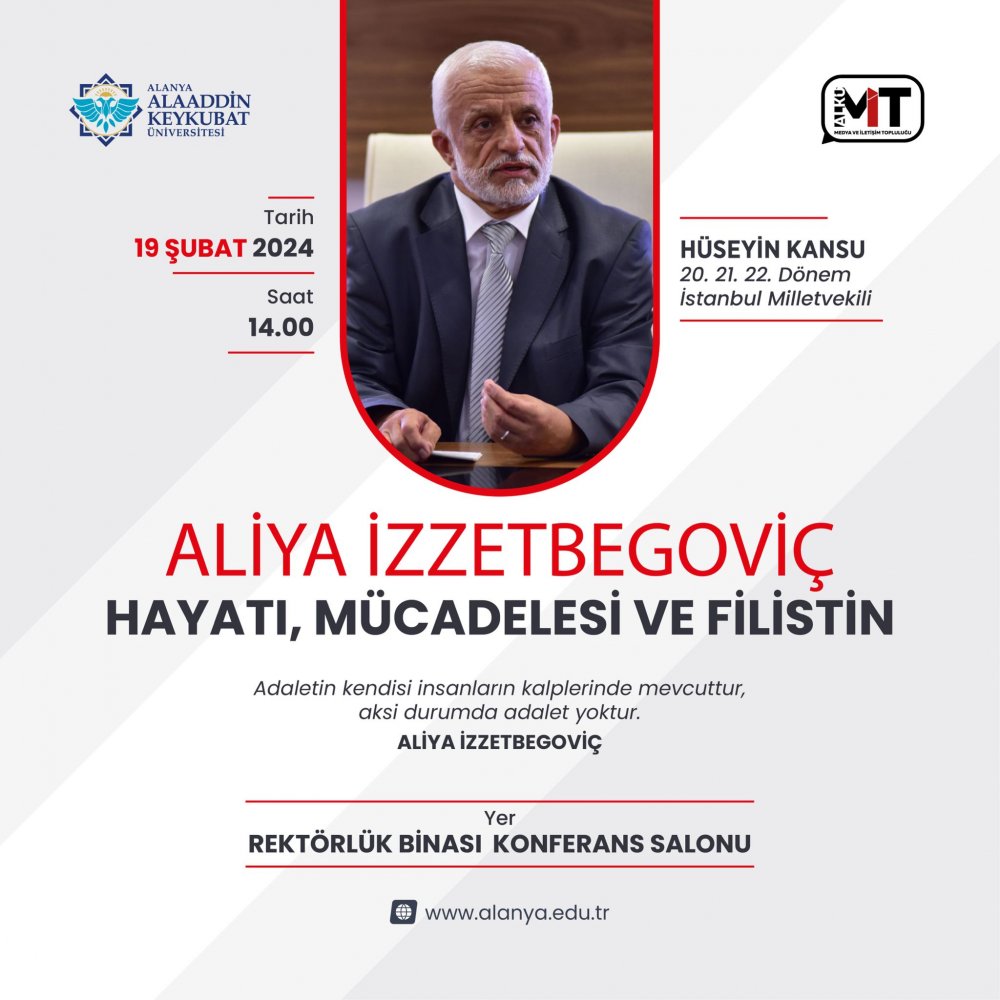 Alanya Alaaddin Keykubat Üniversitesinde (ALKÜ) 20, 21, ve 22. Dönem İstanbul Milletvekili Hüseyin Kansu’nun anlatımıyla “Aliya İzzetbegoviç Hayatı, Mücadelesi ve Filistin” isimli konferans gerçekleşecek.