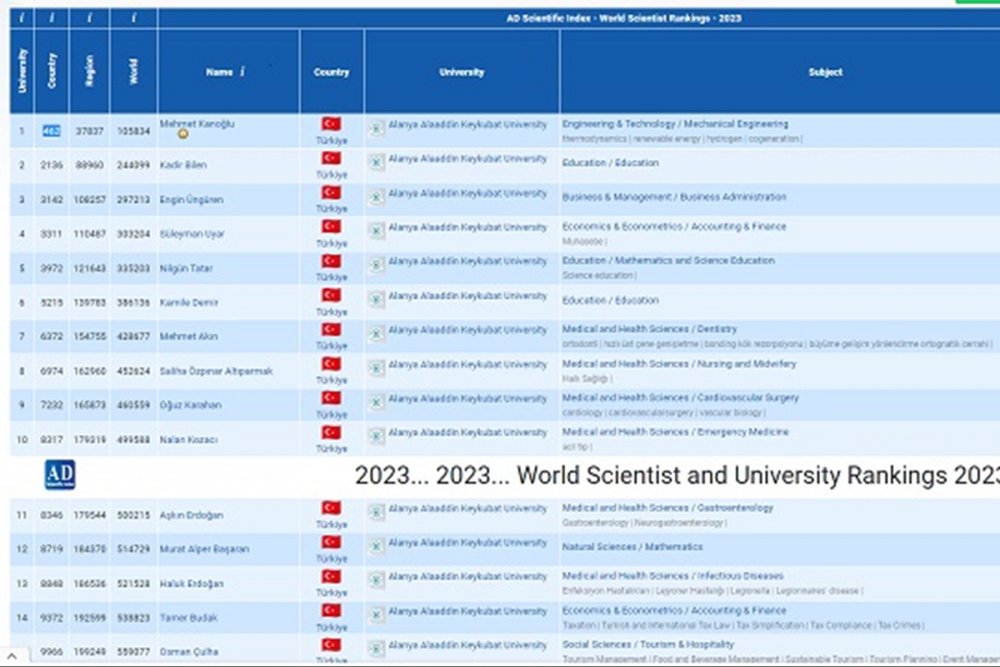Uluslararası sıralama kuruluşu "AD Scientific Index"'in Google Scholar açık profillerine göre AD Scientific Index-2023 "Turkey Top 10.000 Scientists / Türkiye’nin en başarılı 10.000 akademisyeni listesi” adscientificindex.com adresinde yayınlandı. 216 ülke ve 195 bin 60 üniversite ve kurumdaki 1 milyon 82 bin akademisyenden oluşan listede yer alan Türkiye adresli en çok atıf alan ve en yüksek H index'ine sahip ilk 10 bin akademisyeni gösteren listede Alanya Alaaddin Keykubat Üniversitesi’nde (ALKÜ) görevli 80 akademisyen de yer aldı. ALKÜ’nün en fazla atıf alan ve en yüksek H endeksine sahip akademisyeni Rafet Kayış Mühendislik Fakültesi Makine Mühendisliği Bölümü Öğretim Üyesi Prof. Dr. Mehmet Kanoğlu oldu. Eğitim Fakültesi Matematik ve Fen Bilimleri Fakültesi Öğretim Üyesi Prof. Dr. Kadir Bilen ikinci, İktisadi, İdari ve Sosyal Bilimler Fakültesi İşletme Bölümü Öğretim Üyesi Dr. Öğr. Üyesi Engin Üngüren ise üçüncü sırada yer aldı. Listede yine İktisadi, İdari ve Sosyal Bilimler Fakültesi Öğretim Üyesi Prof. Dr. Süleyman Uyar dördüncü, Eğitim Fakültesi Öğretim Üyesi Prof. Dr. Nilgün Tatar da beşinci sırada gösterildi.