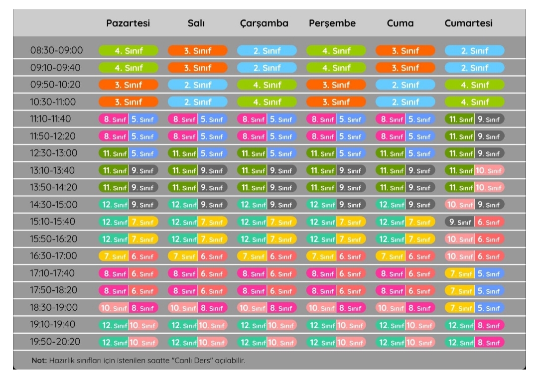 Milli Eğitim Bakanı Ziya Selçuk, Eğitim Bilişim Ağı (EBA) canlı ders programını paylaştı. Bakan Selçuk, sosyal medya hesabından yeni yılda öğrencilere seslendi. Selçuk, “Sizden büyük bir ricam var. Lütfen bizim için okuyun, yazın, derslerinizi izleyin, canlı dersleri kaçırmayın, konuşun, anlatın, fikrinizi ifade edin. Bu ülkenin size, çabanıza ve enerjinize ihtiyacı var” diye konuştu. Paylaşımda ayrıca 1'inci sınıflar hariç, 2-12'nci sınıf öğrencilerinin canlı ders programı tablosuna yer verildi. Güncelleme Tarihi: 31 Ağustos 2020, 09:18