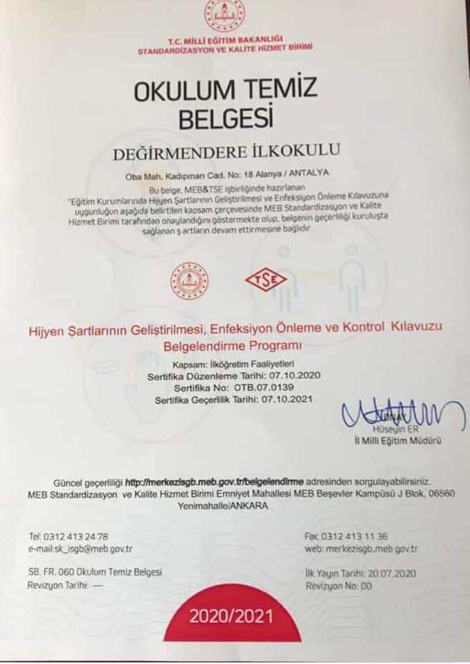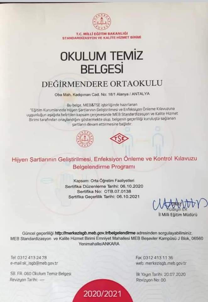 Alanya'nın Değirmendere Mahallesi Muhtarı Kasım Günay, "Değirmendere ilkokulu ortaokulu normal eğitime geçerek haftanın 5 günü derslere devam ediyor. Okulumuz Alanyada TSE'den Okulum Temiz Belgesi alan ilk devlet okullarından olup Beyaz Bayrak sahibi olup hijyen ve temizlik konusunda sertifikalı bir okul olarak çocuklarımızı bu pandemi döneminde içimiz rahat olarak okula gönderiyoruz.