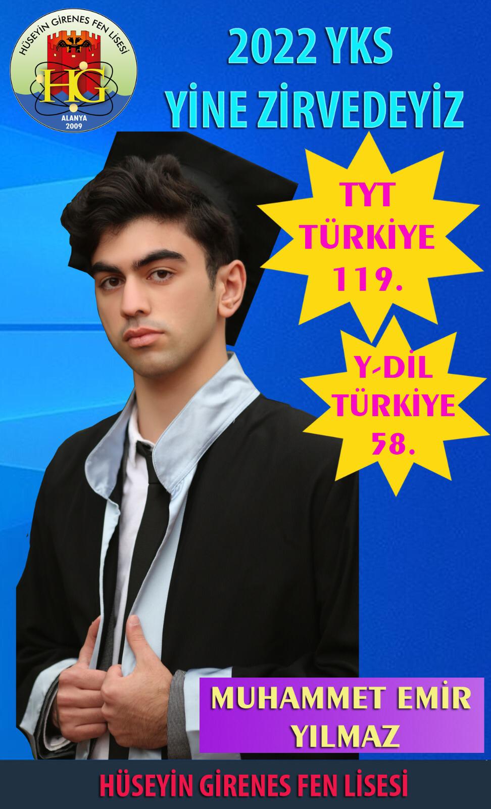 Y-Dil puan türünde Türkiye 58. Antalya 1. ve Alanya 1.si TYT Puan türünde Türkiye 119. Alanya 1. olan Muhammet Emir Yılmaz’ı,