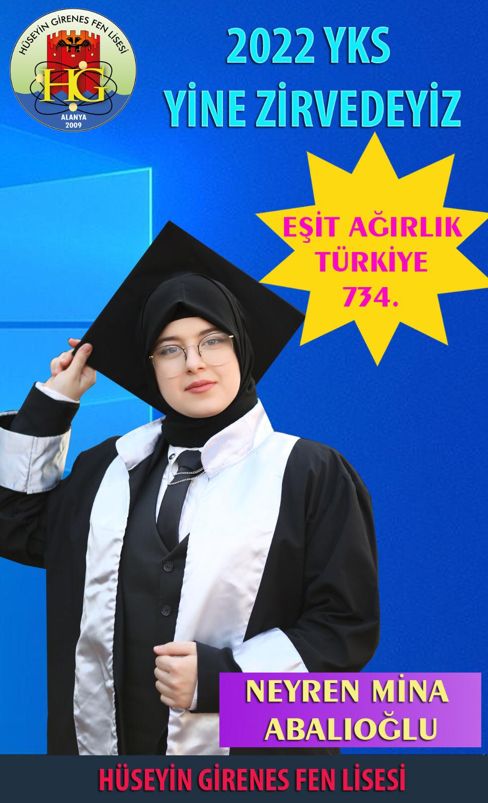 EA puan türünde Türkiye 734. Alanya 1. olan Neyren Mina Abalıoğlu’nu,