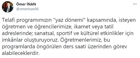 Milli Eğitim Bakanlığı (MEB) Personel Genel Müdürü Ömer İnan, 2 Temmuz sonrasında başlayacak olan telafi dersleri hakkında sosyal medya hesabından bir paylaşım yaptı. Genel Müdür İnan, yaptığı paylaşımda, “Telafi programımızın ‘yaz dönemi' kapsamında, isteyen öğretmen ve öğrencilerimize, ikamet veya tatil adreslerinde; sanatsal, sportif ve kültürel etkinlikler için imkânlar oluşturuyoruz. Öğretmenlerimiz, bu programlarda öngörülen ders saati üzerinden görev alabileceklerdir” ifadelerini kullandı.