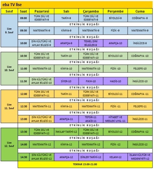 Milli Eğitim Bakanlığı, Kovid-19 tedbirleri kapsamında eğitime verilen arada ilkokul, ortaokul ve lise öğrencilerine verilecek uzaktan eğitim ile ilgili ders programını açıkladı. Derslerin 20 dakika süreceğini açıklayan Milli Eğitim Bakanı Ziya Selçuk, ilk dersi de kendisi verecek. ‘EBA TV' kanalı adı altında yapılacak uzaktan eğitim programı kapsamında dersler sabah 09.00'da başlayacak. Dersleri kaçıranlar ya da tekrar izlemek isteyenler için ‘EBA TV' de belirli saatlerde tekrarlar yapılacak.