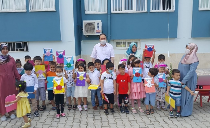 Mahmutlar Emin Özmüftüoğlu Kız Kur’an Kursu bünyesinde bulunan 4-6 Yaş Grubu Kuran Kursu’nun yıl sonu programına da katılan Müftü İlhan, öğrencilerin mezuniyet sevincine ortak olarak öğrencilere tek tek karnelerini takdim etti.