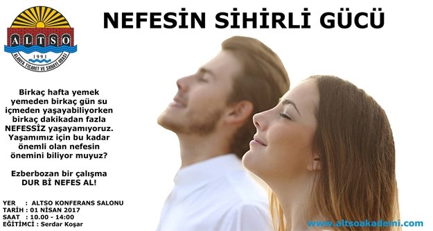 ALTSO Akademi'nin 2017 yılı birinci dönem kişisel gelişim seminerleri Serdar Koşar'ın katılacağı 'Nefesin Sihirli Gücü' semineriyle devam ediyor.