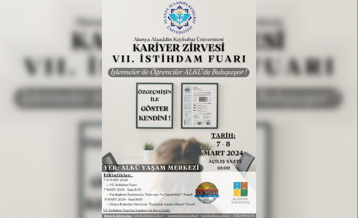 Alanya Alaaddin Keykubat Üniversitesi (ALKÜ), akademik başarının artırılmasına yönelik çalışmaların yanında öğrencilerinin kariyer planlamalarına katkı sunan, onları iş dünyasıyla buluşturan, pratik deneyimlerle donanmış bireyler yetiştirme vizyonunu da sürdürüyor. Bu kapsamda; ALKÜ, Alanya Üniversitesi ve Alanya Ticaret ve Sanayi Odası (ALTSO) iş birliğinde 7’ncisi düzenlenen ve turizmden inşaata, eğitimden teknolojiye birçok sektörü bir araya getiren “ALKÜ Kariyer Zirvesi VII. İstihdam Fuarı” yarın kapılarını aralayacak. 7-8 Mart tarihlerinde ALKÜ Yaşam Merkezi’nde gerçekleşecek olan fuar, 70'ten fazla firma ile katılımcılara kariyer olanakları sunacak. Açılışı saat 09.00'da gerçekleşecek olan fuarda etkinlik boyunca çeşitli workshoplar, ikramlar ve sektörel standlar ziyaretçilere farklı deneyim imkânı sağlayacak. İş dünyasının temsilcileri ile öğrencilerin buluştuğu fuarda; turizm, inşaat, eğitim, teknoloji gibi alanlarda faaliyet gösteren sektörlerin açılan standları ve yapılan workshopları ile öğrenciler; istihdam ve staj imkanları için firmalarla bire bir görüşme fırsatı bulacak. Fuarın ikinci gününde, saat 11.00’de 8 Mart Dünya Kadınlar Günü'ne özel “Turizmde Kadın Olmak” konulu panelde, kadınların turizmdeki rolü vurgulanarak bu alandaki başarıları ve katkıları üzerinde durulacak.
