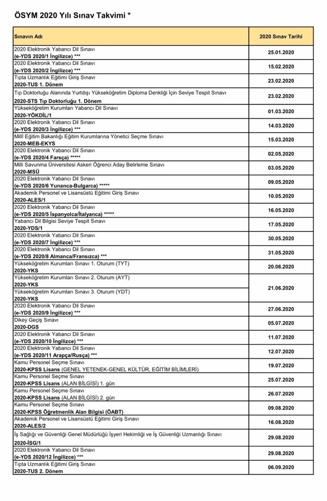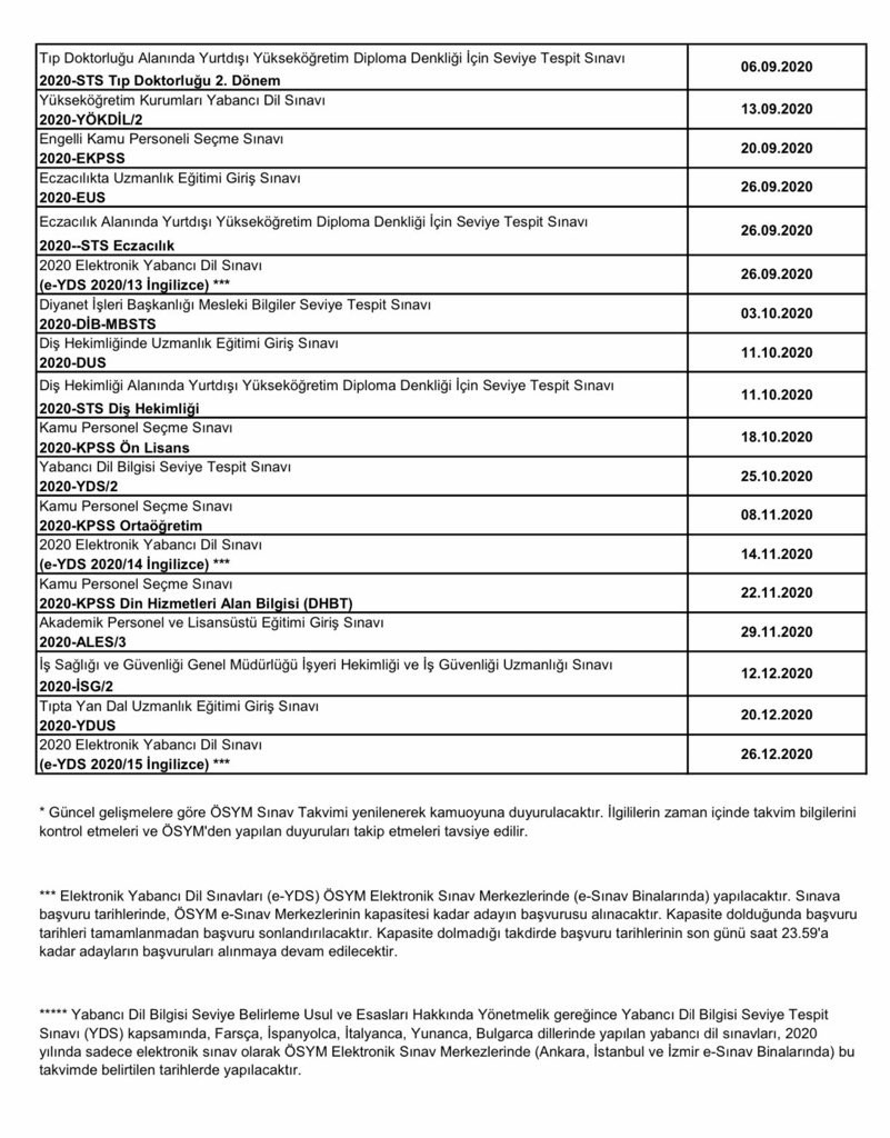 Kovid-19 salgınının Türkiye'de de görülmesi sonrasında tedbirler arttırıldı. Türkiye genelinde çok sayıda kişinin gireceği Yükseköğretim Kurumları Yabancı Dil Sınavı (YÖKDİL), Elektronik Yabancı Dil Sınavı (e-YDS), Milli Savunma Üniversitesi Askeri Öğrenci Aday Belirleme Sınavı (MSÜ), İş Sağlığı ve Güvenliği Genel Müdürlüğü İşyeri Hekimliği ve İş Güvenliği Uzmanlığı Sınavı (İSG/1), Akademik Personel ve Lisansüstü Eğitimi Giriş Sınavı (ALES), Diyanet İşleri Başkanlığı Mesleki Bilgiler Seviye Tespit Sınavı (DİB-MBSTS), Engelli Kamu Personeli Seçme Sınavı (EKPSS) ertelendi. ÖSYM'nin sınav takvimi güncellenerek osym.gov.tr internet adresinde yayımlandı. Buna göre e-YDS/4'ün 2 Mayıs'ta, MSÜ'nün 3 Mayıs'ta, ALES/1'in 10 Mayıs'ta, e-YDS/5'in 16 Mayıs'ta, YDS/1'in 17 Mayıs'ta, ALES/2'nin 16 Ağustos'ta, İSG/1'in 29 Ağustos'ta, EKPSS'nin 20 Eylül'de, DİB-MBSTS'nin 3 Ekim'de yapılacağı açıklandı.