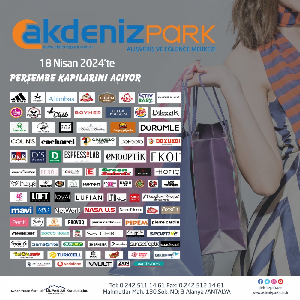 Alanyum AVM’nin de sahibi olan ÜLPAŞ AŞ tarafından Mahmutlar’a kazandırılacak olan AVM’de çok sayıda seçkin marka ve mağaza bulunuyor. ÜLPAŞ Yönetimi, tüm Alanya halkını Akdeniz Park AVM’yi keşfetmeye davet etti. Sabah 10.00 ile akşam 22.00 saatleri arasında hizmet verecek olan alışveriş merkezinin resmi açılış töreni ise ilerleyen günlerde yapılacak.