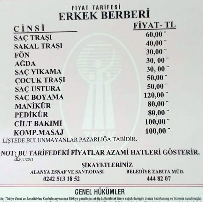 Alanya’da 1 Ocak 2022 itibariyle; saç tıraşı 60 TL, sakal tıraşı 40 TL, fön 30 TL, ağda 30 TL, saç yıkama 30 TL, çocuk tıraşı 50 TL, saç ustura 50 TL, saç boyama 120 TL, manikür 80 TL, pedikür 80 TL, cilt bakımı 100 TL ve komple masaj 100 TL oldu