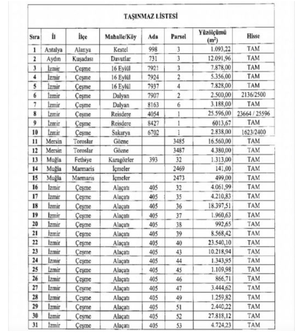 Resmi Gazete’de yayımlanan Cumhurbaşkanlığı kararıyla Çeşme, Alanya, Kuşadası, Marmaris, Fethiye ve Mersin-Toroslar’da bulunan 31 parsel arazi ihale kapmasına alındı.