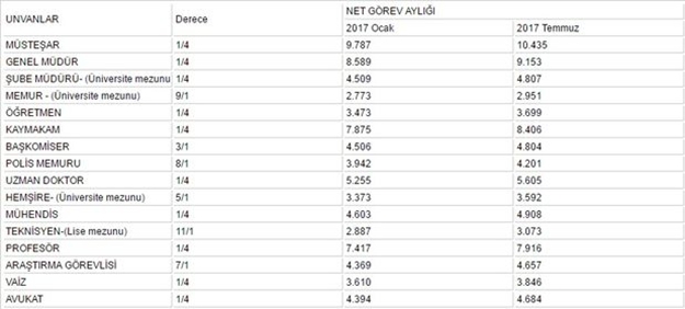 Açıklamaya göre, söz konusu artışlar neticesinde 2017 yılı ocak ve temmuz dönemleri itibarıyla bazı kamu görevlilerinin net maaşları şöyle: