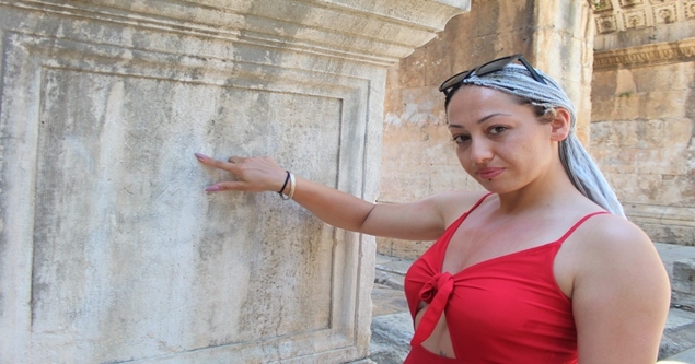 Aslı Karataş ise Kaleiçi’ni ve herkesin övgüyle bahsettiği Üç Kapılar’ı görmek için geldiklerini ifade ederek, “Ama tarihi yapının kolonuna yazılar yazmışlar. Yazı yazmışlar. Yaklaşık buranın 2 bin yıllık tarihinin var olduğunu biliyorum. Yazıları yazanı kınıyoruz.” dedi.