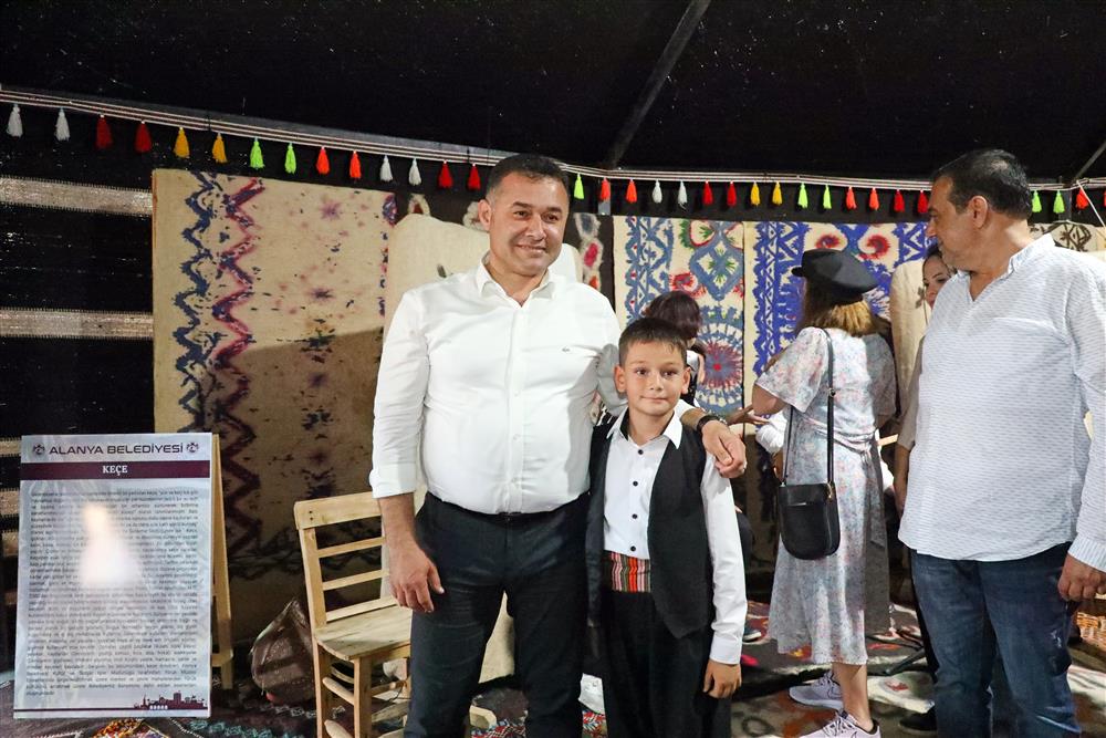 27 Mayıs’ta açılan ve 30 Mayıs’a kadar zengin bir programla devam eden Alanya Uluslararası Turizm ve Sanat Festivali’nde kurulan dev Yörük Çadırında, Alanya mutfak kültürü, bakır ibrikler, kazanlar, bakır siniler, tabaklar, yemek kap kacakları, temsili yayla göçü ve göç sırasında kullanılan dokuma heybeler, kilimler, çuvallar, keçeler, beşikler, sandıklar, hamur tekneleri gibi pek çok kültürel miras; ziyaretçilerine unutulmaz anılar yaşattı.