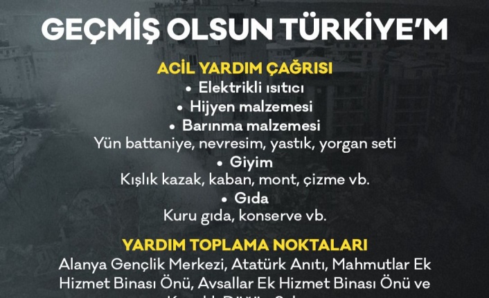 Deprem sonrası Alanya’da yardım seferberliği başlatıldı. Alanya Kaymakamlığı ve Alanya Belediyesi koordinasyonunda başlatılan yardım kampanyası, ilk etapta acil ihtiyaç olan malzemelerin toplanacağı yardım kampanyasını sosyal medya hesabından yapmış olduğu paylaşım ile duyuran AK Parti Alanya İlçe Başkanı Mustafa Toklu;