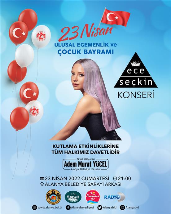 Alanya Belediyesi, 23 Nisan Ulusal Egemenlik ve Çocuk Bayramı’nın coşku ve neşe içerisinde kutlanabilmesi için hazırlıklarını tüm hızıyla sürdürüyor. Bu kapsamda Alanya Belediyesi Ece Seçkin konseriyle Alanyalılara unutulmaz bir 23 Nisan gecesi yaşatacak. Ünlü şarkıcı, gün boyu devam edecek etkinliklerin ardından saat 21.00’de Alanya Belediye Sarayı arkasında ücretsiz konser verecek.