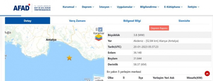 Afet ve Acil Durum Yönetimi Başkanlığından (AFAD) alınan bilgiye göre, saat 08.37’de Akdeniz’de 3.8 büyüklüğünde deprem oldu. Antalya’nın Alanya ilçesine açıklarında meydana gelen deprem yerin 58,37 km derinliğinde gerçekleşti. Deprem nedeniyle herhangi bir olumsuzluk yaşanmadı. Sabah saatlerinde depremi hisseden vatandaşlar, “Hafif sallandık çok şiddetli değildi ama yine de hissettik” dedi.