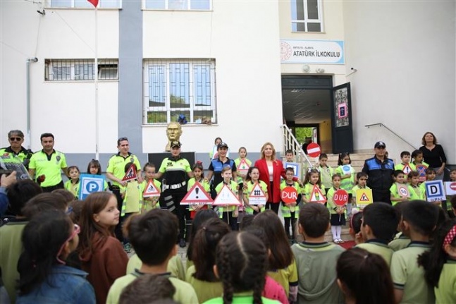 Alanya Belediyesi, İlçe Emniyet Müdürlüğü ve İlçe Jandarma Komutanlığı tarafından Trafik ve İlk Yardım Haftası’nda Atatürk İlkokulu’nda minik öğrencilere trafik eğitimi verildi.