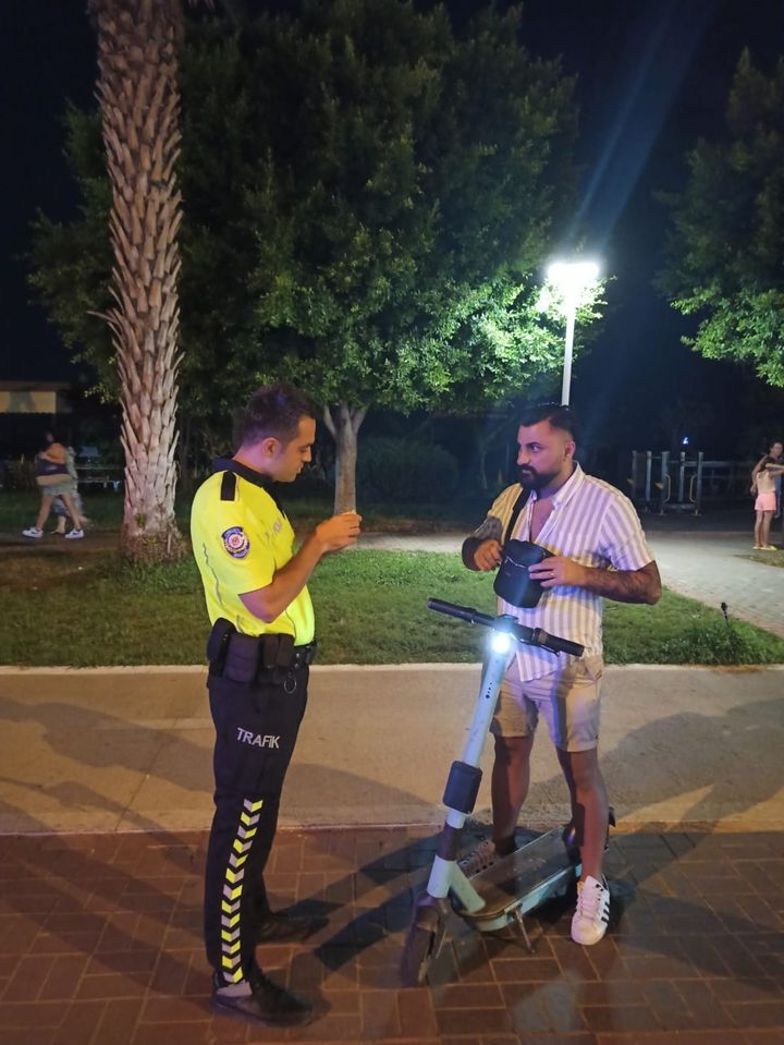 Alanya Kaymakamlığı'ndan yapılan açıklamada şu ifadelere yer verildi: 'İlçemizde yaygın olarak kullanılan binbin (e-scooter) sürücülerine yönelik 28.08.2023 günü 20.00-21.00 saatleri arasında Alanya İlçe Emniyet Müdürlüğü trafik ekiplerimiz tarafından denetimler yapılmıştır. Yapılan denetimlerde; 45 E-Scooter sürücüsü kontrol edilmiş. Sürücü şartlarını taşımadığı belirlenen 7 e-scooter (binbin) Sürücüsüne 6,657 TL ceza uygulanmıştır.
