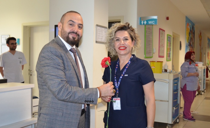 Alanya Eğitim ve Araştırma Hastanesi (EAH) Başhekimi Doç. Dr. Oğuz Karahan, hastane yönetimi ile birlikte hastanenin farklı birimlerinde görev alan kadın çalışanlarını yerinde ziyaret ederek “8 Mart Dünya Kadınlar Günü’nü” karanfil ile kutladı.