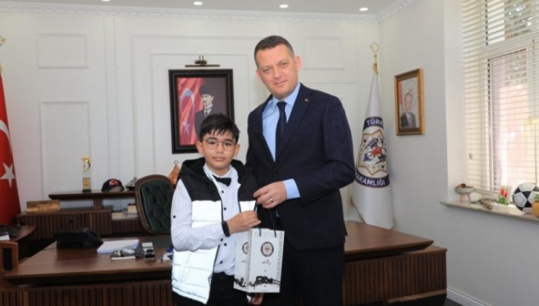 Kaymakam Ürkmezer, 23 Nisan Ulusal Egemenlik ve Çocuk Bayramı etkinlikleri kapsamında Parlayüksel İlkokulu 4. sınıf öğrencisi Ahmet Batu Yaşar ve okul müdürü İbrahim Yıldırım ile öğretmeni Hale Turgut’u makamında ağırladı.