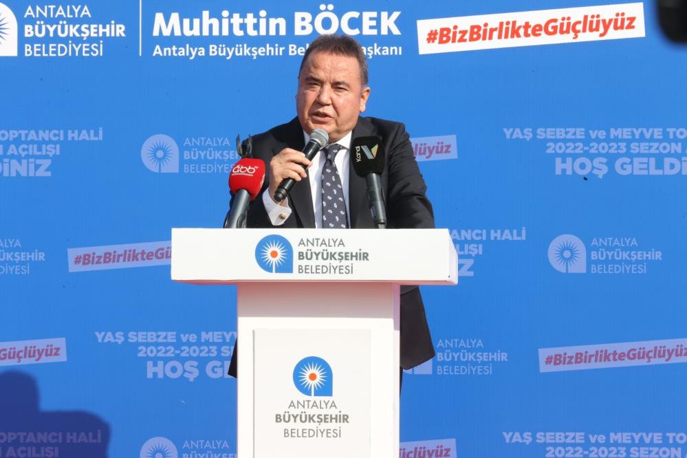 Kendisine üreticilerin ‘halden anlayan başkan’ dediğini aktaran Başkan Böcek, “Cam seralardan çıkmış bir arkadaşınızım. Üreticimize destek olmaya çalışıyoruz. 7’si Alanya’da bulunan 51 sulama kooperatifinin harcadığı enerjinin neredeyse yüzde 80’ini ödüyoruz. Afet gören üreticimize destek olmaya çalışıyoruz. Antalya’da 21 halimiz var. Türkiye’nin en büyük iş hacmine sahip hallerimizde 858 hal komisyoncusu 931 de tüccar var. Halden anlayan bir belediye olarak çalışmalarımızı sürdürüyoruz” diye konuştu. Göreve geldiklerinde inşaatı yüzde 30 seviyelerinde olan Alanya Toptancı Hali’ni tamamlamak için bugüne kadar 210 milyon lira harcadıklarını anlatan Başkan Böcek, “100 milyon lira daha yatırım yaparak, projeyi 2023’te tamamlayacağız. Yeni sezonumuzun tüm üreticilerimize hayırlı olmasını bol kazanç getirmesini diliyorum” ifadelerini kullandı.
