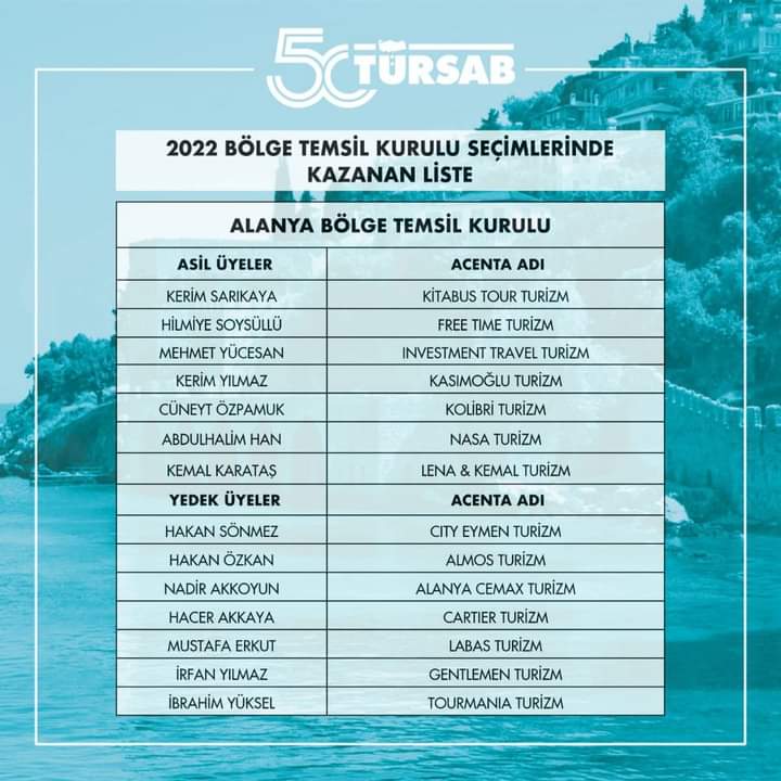 Türkiye Seyahat Acenteleri Birliği (TÜRSAB) Alanya Bölgesel Temsil Kurulu'nun 25'inci (BTK) Olağan Genel Kurulu bugün tamamlandı. Alanya Kültür Merkezi'ndeki seçimde mevcut başkan Bilal Korkmaz ile önceki seçimde de rakibi olan Kerim Sarıkaya yarıştı. İki adayın yarıştığı TÜRSAB Alanya Bölge Temsil Kurulu Başkanlığı seçimini 2 oy farkla Kerim Sarıkaya kazandı.